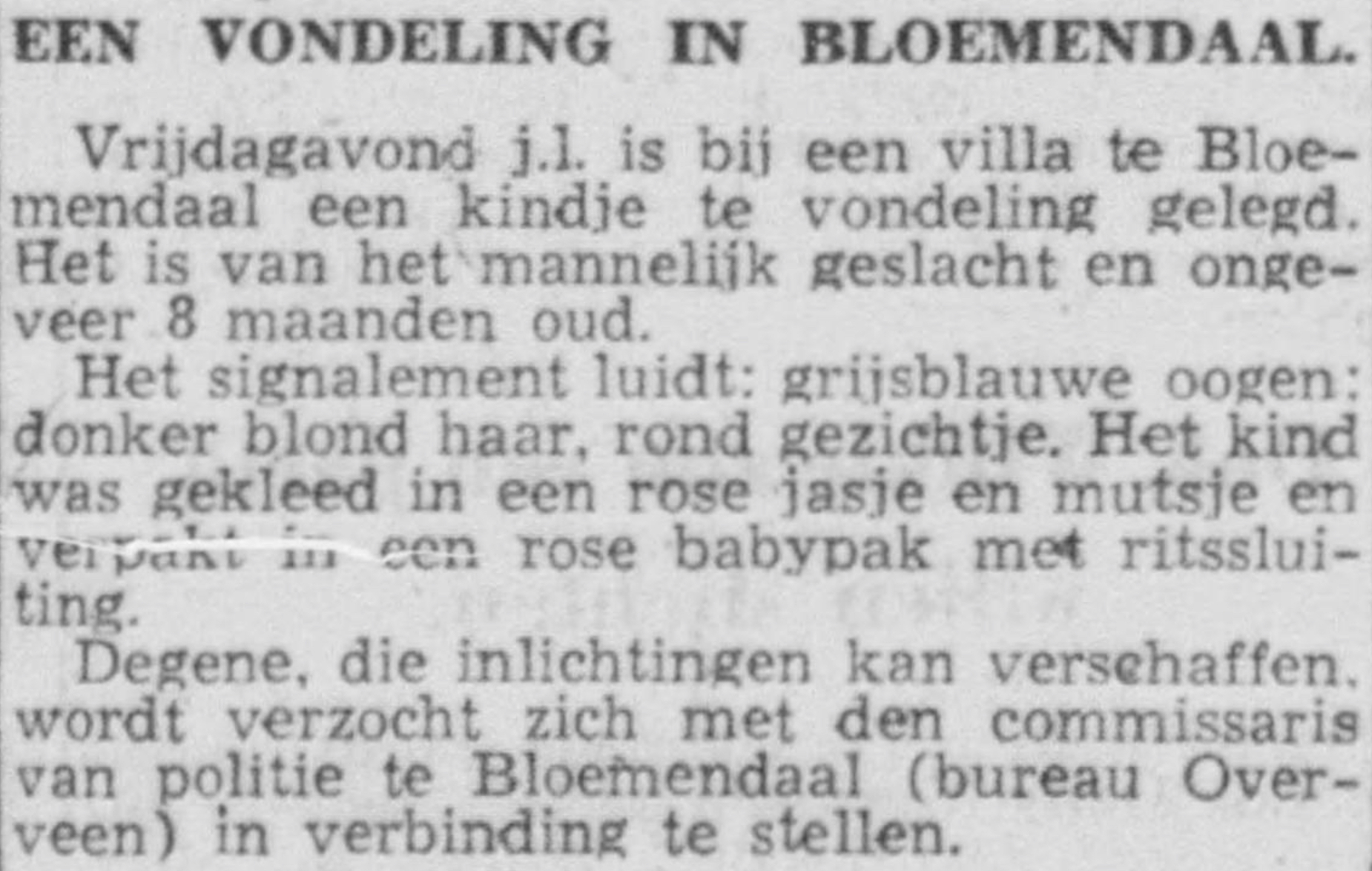 Op een vrijdagavond in oktober hoorde Jo van de Bunt gestommel bij de voordeur van haar villa aan de Duinwijckweg in Bloemendaal. Vanuit de keuken liep ze door de gang en deed open. Op de stoep lag een bundeltje kleren. Toen ze het opraapte zag ze dat er een baby’tje in gewikkeld was. Het bleek een jongetje met grijsblauwe ogen, donkerblond haar en een rond gezichtje. Met zijn roze jasje en mutsje was hij ingeritst in een roze babypakje. Jo zag ineens dat er een flesje met melk naast hem op de stoep stond.